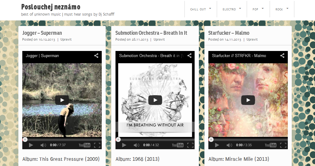 Miluju hudbu a objevování nových kousků od neznámých kapel a hudebních seskupeních a píšu o nich na svém blogu Poslouchejneznámo.cz. Tyhle skladby většinou na parties neuslyšíte, ale stejně byste o nich měli vědět. ;)